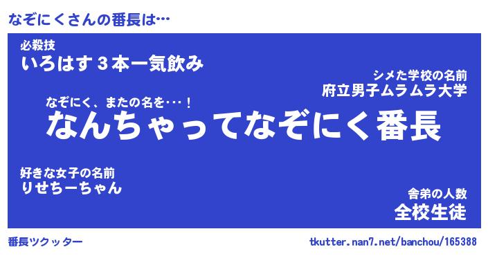 | 意味不明あだ名 | 『ペロリンなぞにく』『永久保存なぞにく』 |