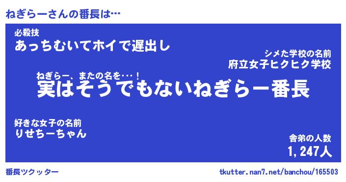 | 意味不明あだ名 | 『ペロリンねぎらー』『永久保存ねぎらー』 |