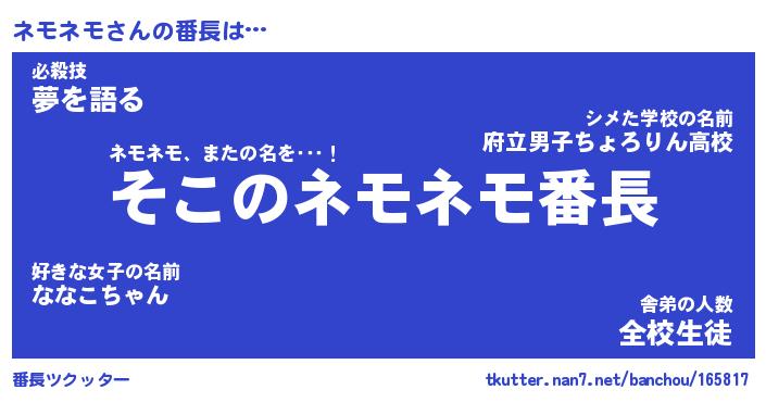 | 意味不明あだ名 | 『ペロリンネモネモ』『永久保存ネモネモ』 |