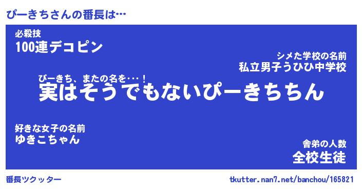 | 意味不明あだ名 | 『ペロリンぴーきち』『永久保存ぴーきち』 |