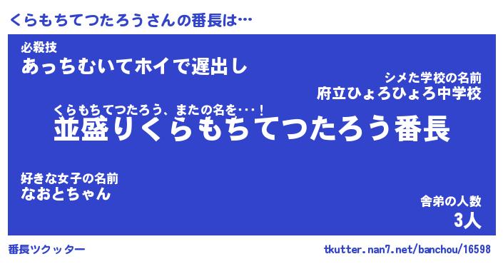 | 男性向けラノベタイトル風あだ名 | 『くらもちてつたろうの憂鬱』 |