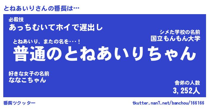 | ヘコむあだ名 | 『とねもー』『レバニラ』『とねっぺ』 |