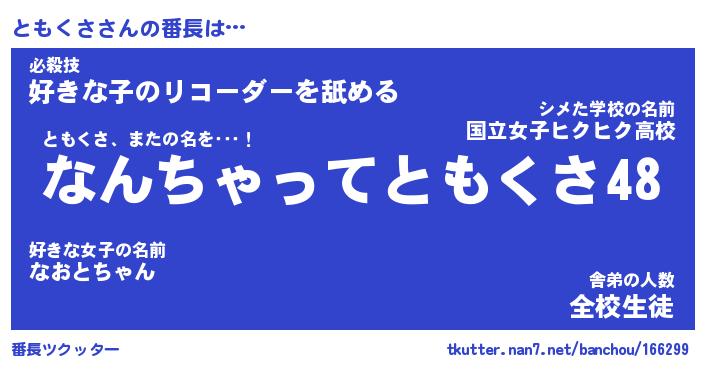 | 意味不明あだ名 | 『ペロリンともくさ』『永久保存ともくさ』 |