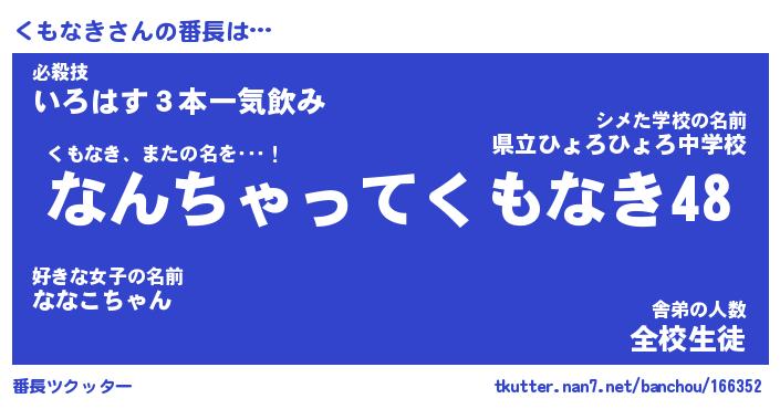 | 恥ずかしいあだ名 | 『プリティーくもなき』『くもっちょ』 |