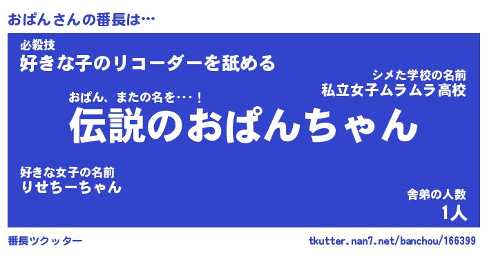 | 肩書あだ名 | 『おぱん御曹司』『おぱん国家主席』 |