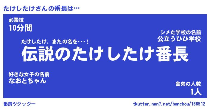 | ヒーロー風カッコイイあだ名 | 『スーパータケシタケ』『暗黒騎士タケ』 |