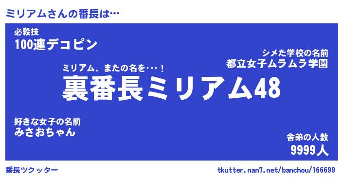 | 意味不明あだ名 | 『ペロリンミリアム』『永久保存ミリアム』 |