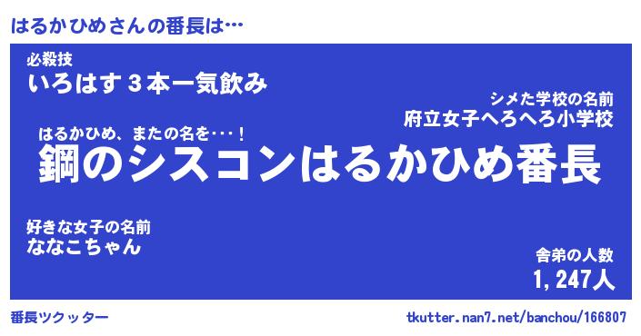 | 肩書あだ名 | 『はるかひめ店長』『はるかひめ総理大臣』 |