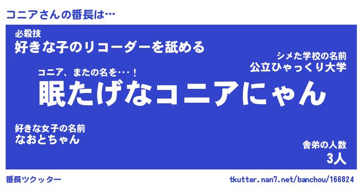 | ヒーロー風カッコイイあだ名 | 『スーパーコニア』『ウルトラコニアマン』 |