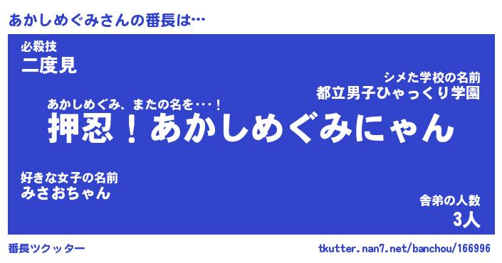| ヒーロー風カッコイイあだ名 | 『スーパーアカシメグミ』『魔戒騎士アカ』 |