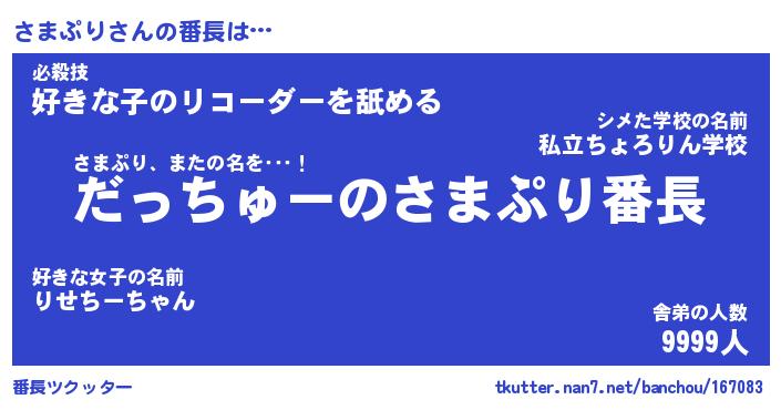 | 伝説のあだ名 | 『伝説のスナイパーさまぷり』 |
