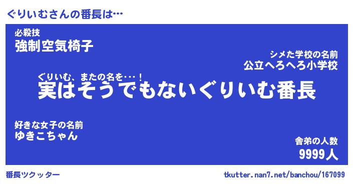 | 肩書あだ名 | 『ぐりいむ社長』『ぐりいむ総理大臣』 |