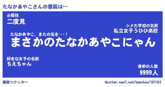 | ヒーロー風カッコイイあだ名 | 『スーパータナカアヤコ』『炎刃騎士タナ』 |