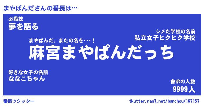 | 伝説のあだ名 | 『不死鳥のスナイパーまやぱんだ』 |