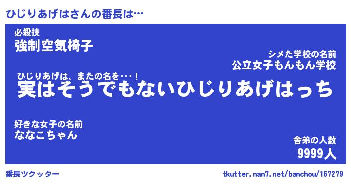 | 伝説のあだ名 | 『封印されしスナイパーひじりあげは』 |