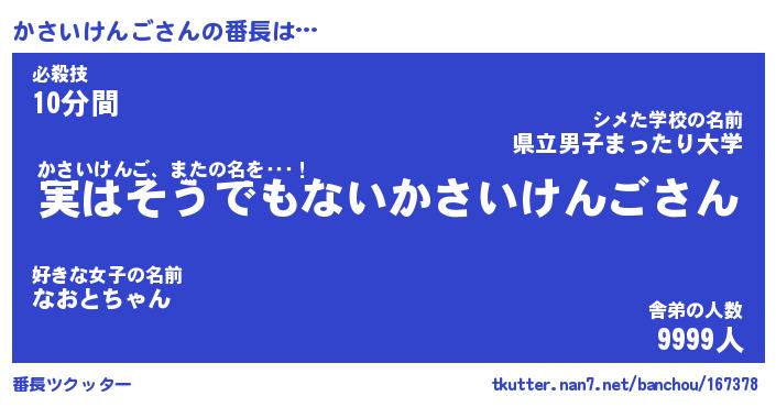 | 男性向けラノベタイトル風あだ名 | 『カサイケンゴアートオンライン』 |