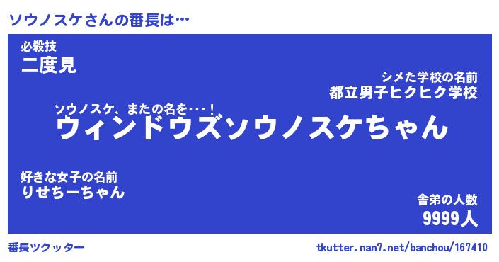 | 伝説のあだ名 | 『伝説のスナイパーソウノスケ』 |