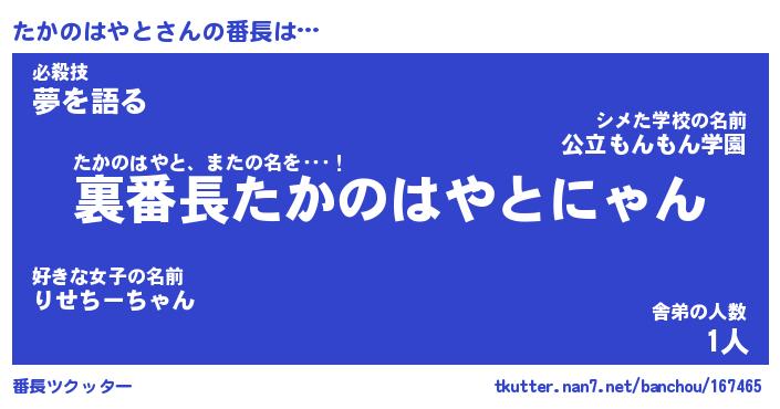 | ヒーロー風カッコイイあだ名 | 『スーパータカノハヤト』『黄金騎士タカ』 |