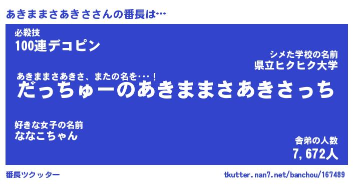 | ヘコむあだ名 | 『あきもー』『つくし』『あきっぺ』 |