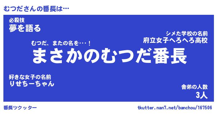 | ヒーロー風カッコイイあだ名 | 『スーパームツダ』『ウルトラむつだマン』 |