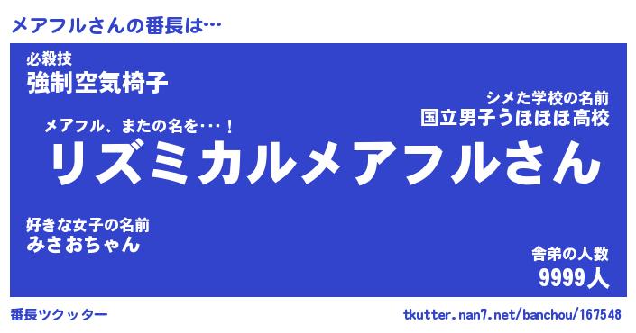 | ファンタジー風あだ名 | 『メアフェル』『エターナルメアフルー』 |