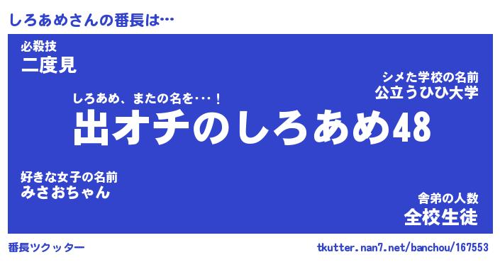 | ヘコむあだ名 | 『しろにゅー』『つくし』『しろ太郎』 |