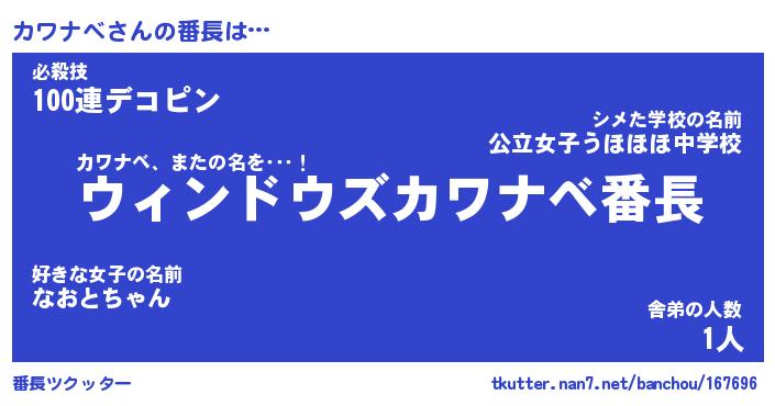 | ヒーロー風カッコイイあだ名 | 『スーパーカワナベ』『銀牙騎士カワ』 |