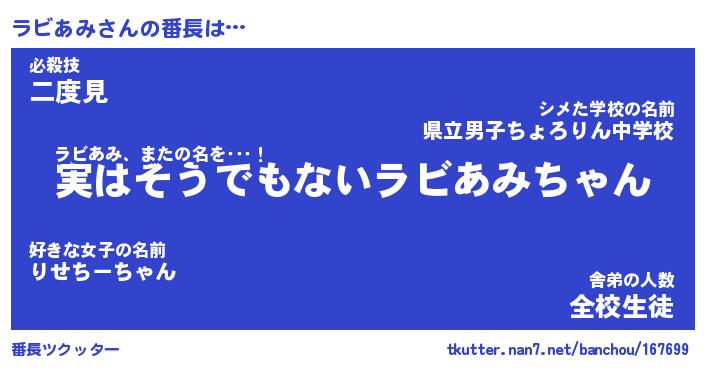 | 意味不明あだ名 | 『ペロリンラビあみ』『永久保存ラビあみ』 |