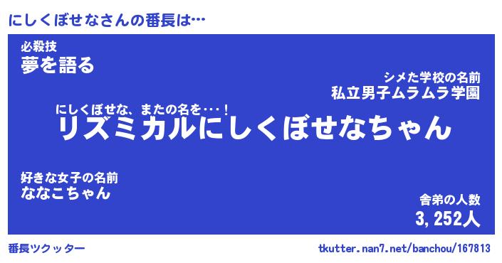 | 2回繰り返すあだ名 | 『にしにし』『ににしし』『ぬぷぬぷ』 |