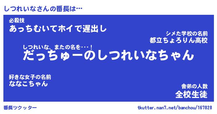| ヒーロー風カッコイイあだ名 | 『スーパーシツレイナ』『暗黒騎士シツ』 |