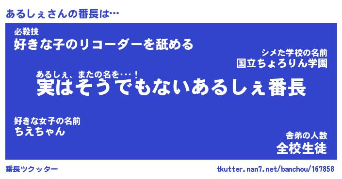 | 意味不明あだ名 | 『ペロリンあるしぇ』『永久保存あるしぇ』 |