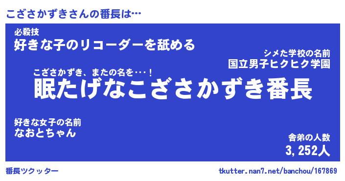 | 肩書あだ名 | 『こざさかずき店長』『こざさかずき担任』 |
