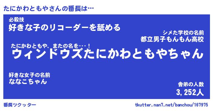 | 伝説のあだ名 | 『伝説のスナイパーたにかわともや』 |
