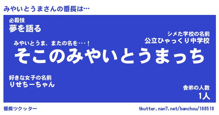 | 肩書あだ名 | 『みやいとうま社長』『みやいとうま班長』 |