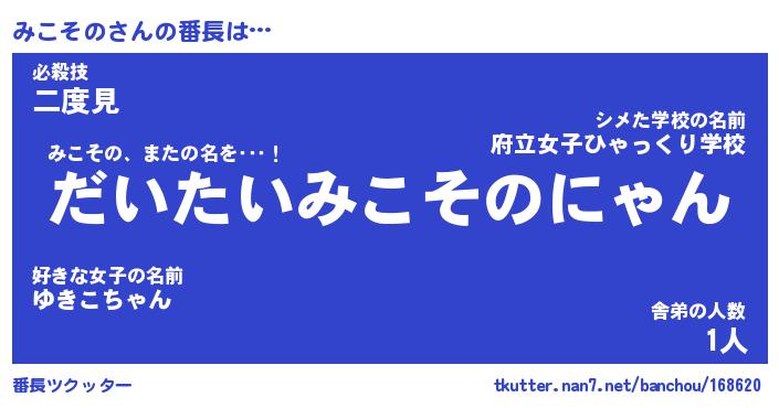 | ヘコむあだ名 | 『みこふぇ~』『豆乳』『みこ太郎』 |