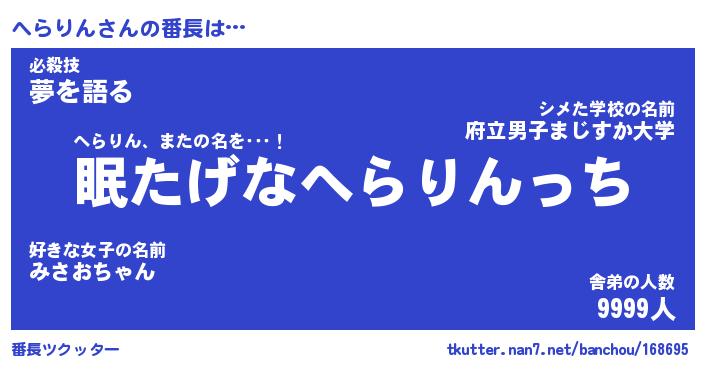 | 意味不明あだ名 | 『ペロリンへらりん』『永久保存へらりん』 |