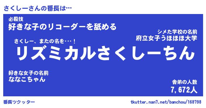 | 意味不明あだ名 | 『ペロリンさくしー』『永久保存さくしー』 |