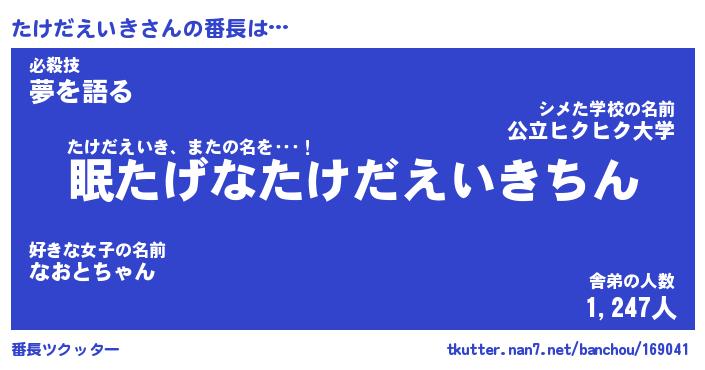 | ヒーロー風カッコイイあだ名 | 『スーパータケダエイキ』『銀牙騎士タケ』 |