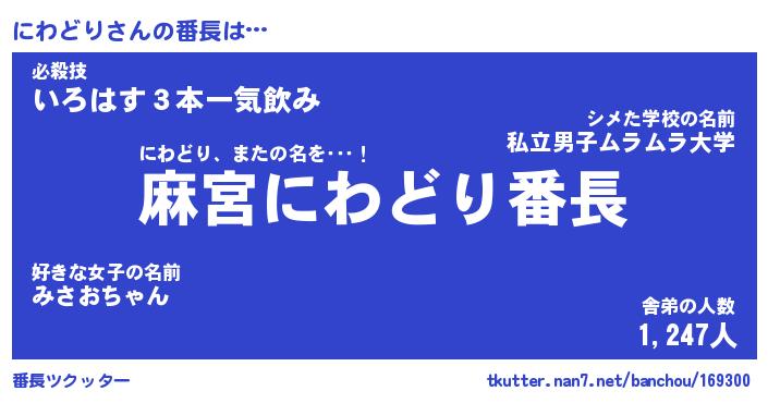 | ヘコむあだ名 | 『にわもー』『なまこ酢』『にわっ子』 |