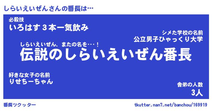| 伝説のあだ名 | 『伝説のスナイパーしらいえいぜん』 |