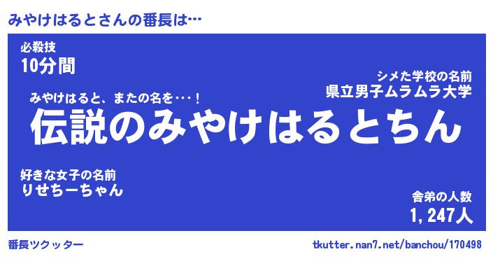 | 男性向けラノベタイトル風あだ名 | 『みやけはるとの憂鬱』 |