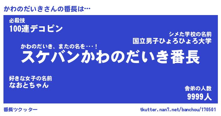 | ヒーロー風カッコイイあだ名 | 『スーパーカワノダイキ』『銀牙騎士カワ』 |