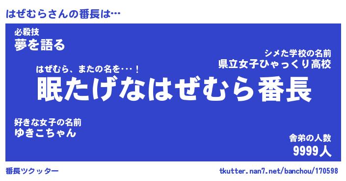 | 伝説のあだ名 | 『封印されしスナイパーはぜむら』 |
