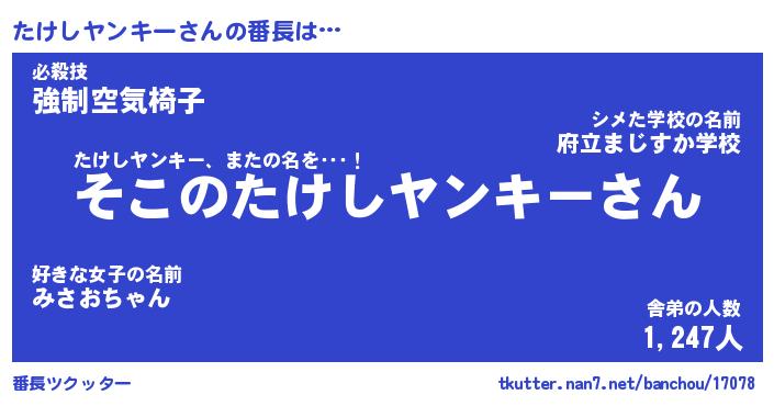 | 男性向けラノベタイトル風あだ名 | 『たけしヤンキーの憂鬱』 |