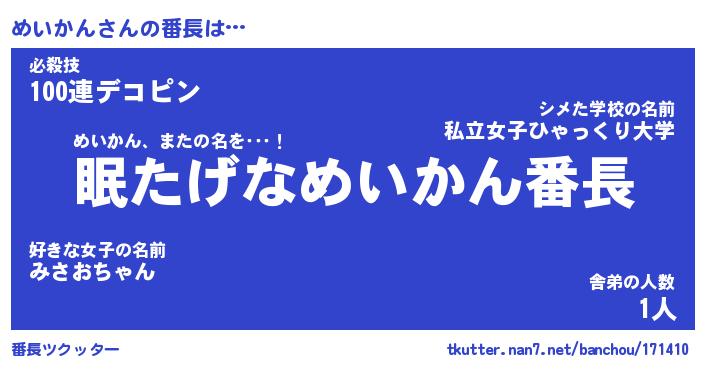 | 意味不明あだ名 | 『ペロリンめいかん』『永久保存めいかん』 |