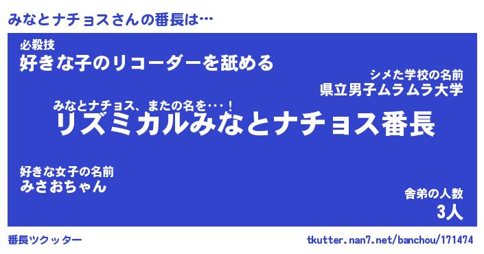 | ポケモン風あだ名 | 『ミナチュウ』『ミナトダネ』 |