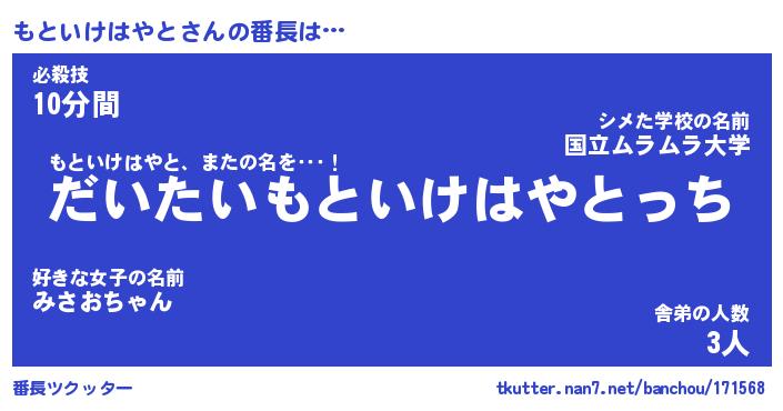 | 男性向けラノベタイトル風あだ名 | 『もといけはやとの憂鬱』 |