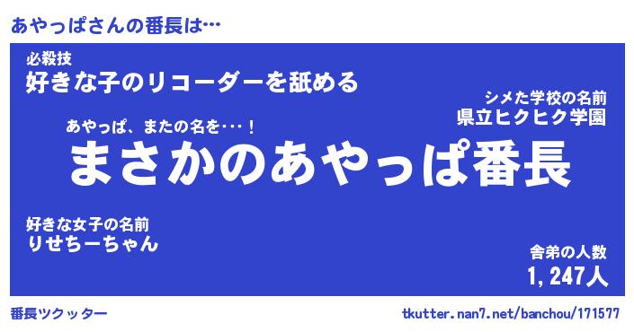 | 伝説のあだ名 | 『伝説のスナイパーあやっぱ』 |