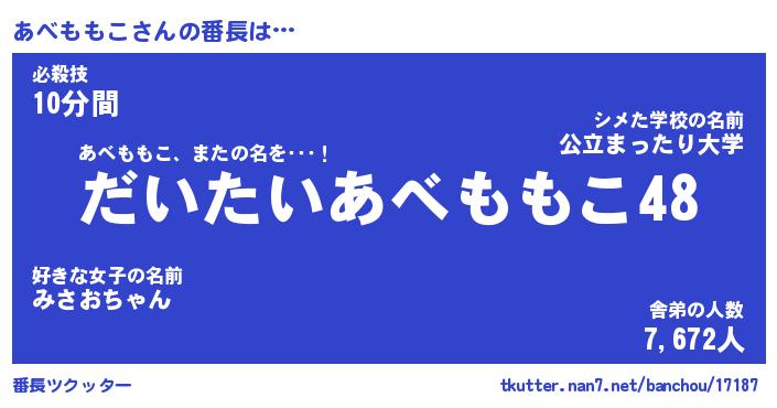 | 肩書あだ名 | 『あべももこ店長』『あべももこ総理大臣』 |