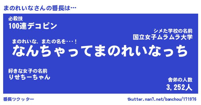 | ヘコむあだ名 | 『まのにゅー』『つくし』『まのっ子』 |